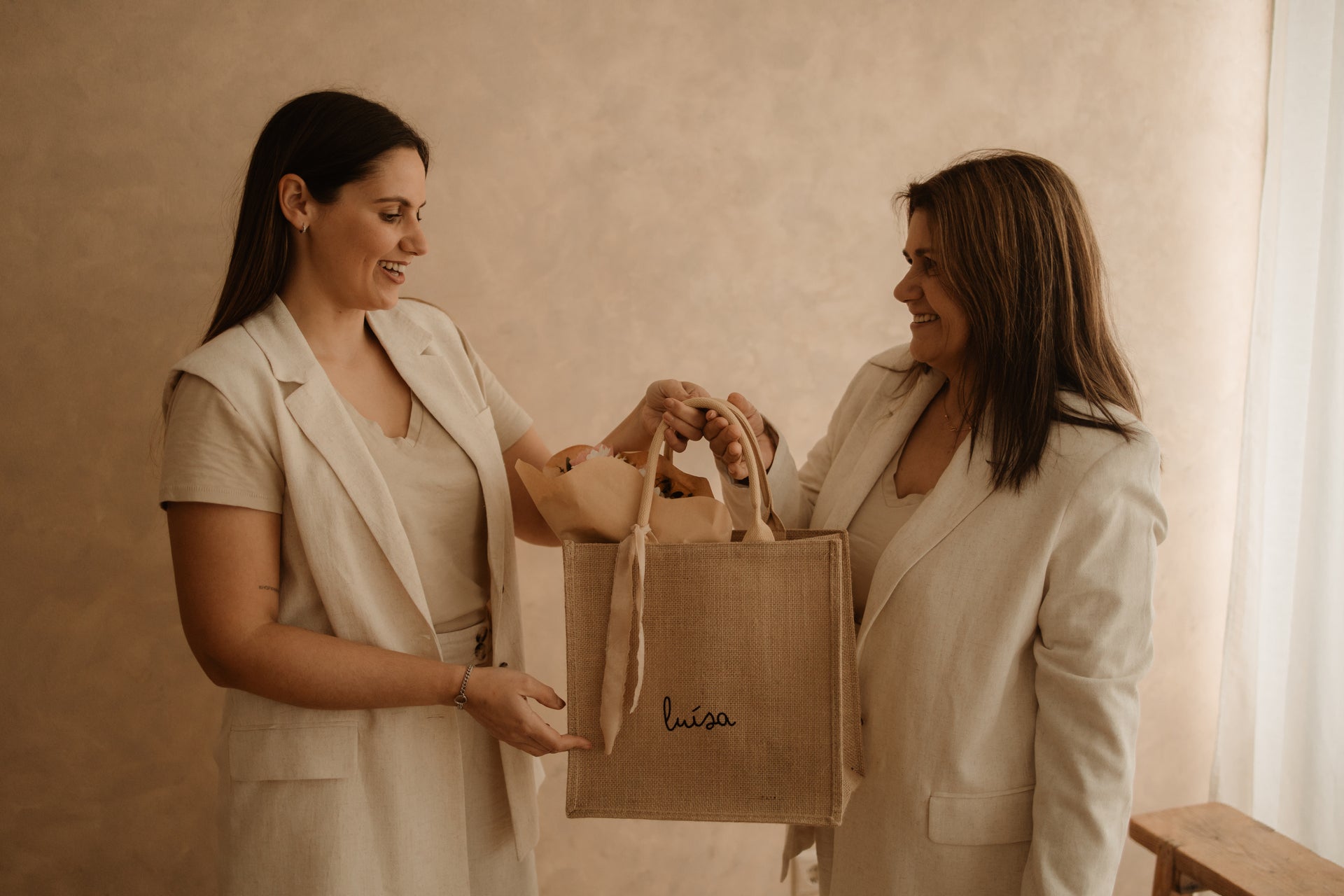 cesta de fibras naturais com um vaso de margaridas ou kalanchoe, topper com nome, sumo de laranja natural, croissant e pendente de madeira.