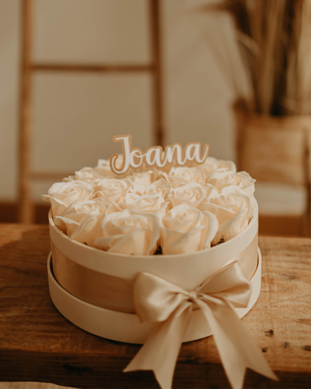 caixa redonda de madeira com rosas de sabão e um topper com nome
