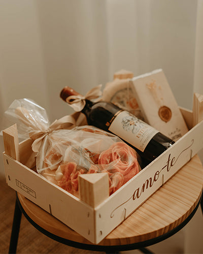 Para os amantes de salgados, uma caixinha de madeira com vinho, queijo e enchidos é o presente ideal!