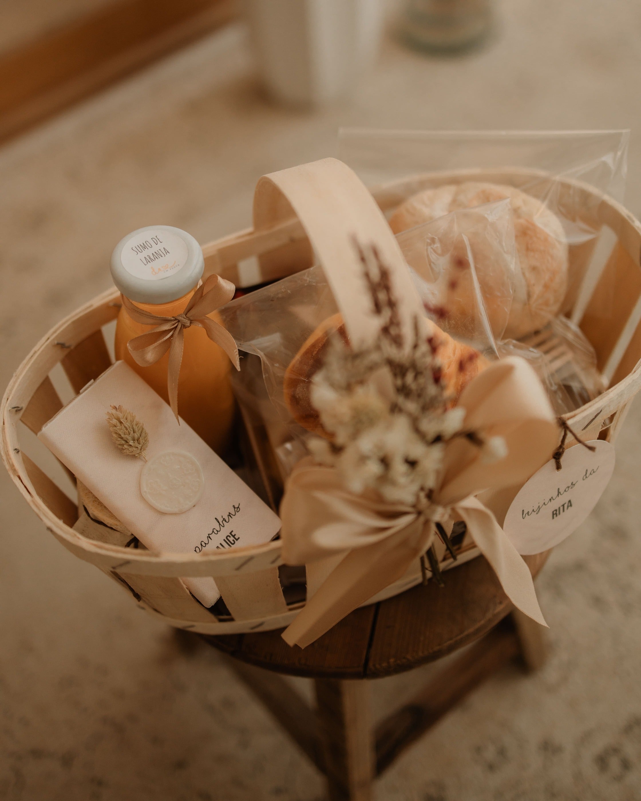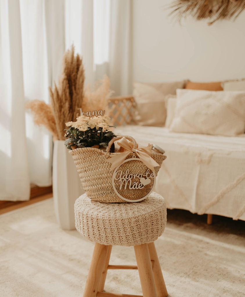cesta de fibras naturais com um vaso de margaridas ou kalanchoe, topper com nome, sumo de laranja natural, croissant e pendente de madeira.