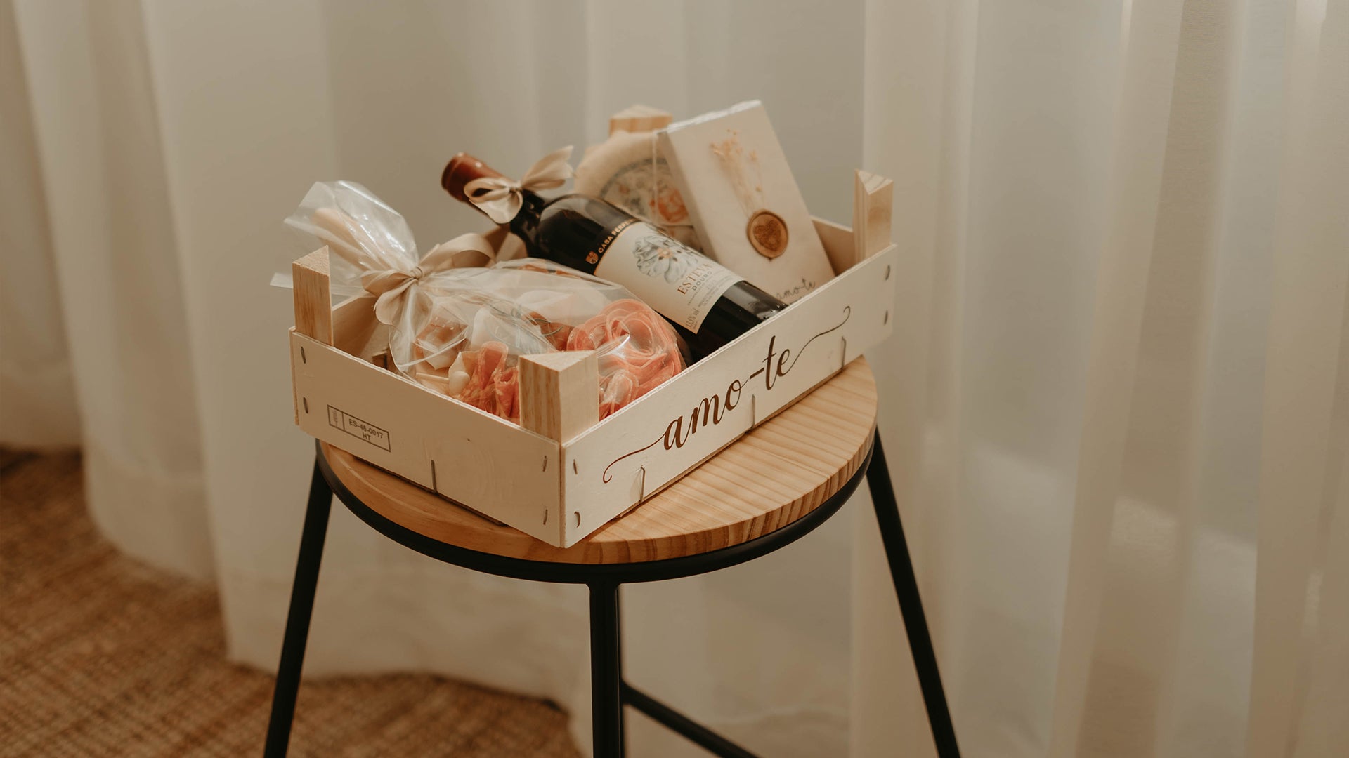 cesta de fibras naturais com um vaso de margaridas ou kalanchoe, topper com nome, sumo de laranja natural, croissant e pendente de madeira.