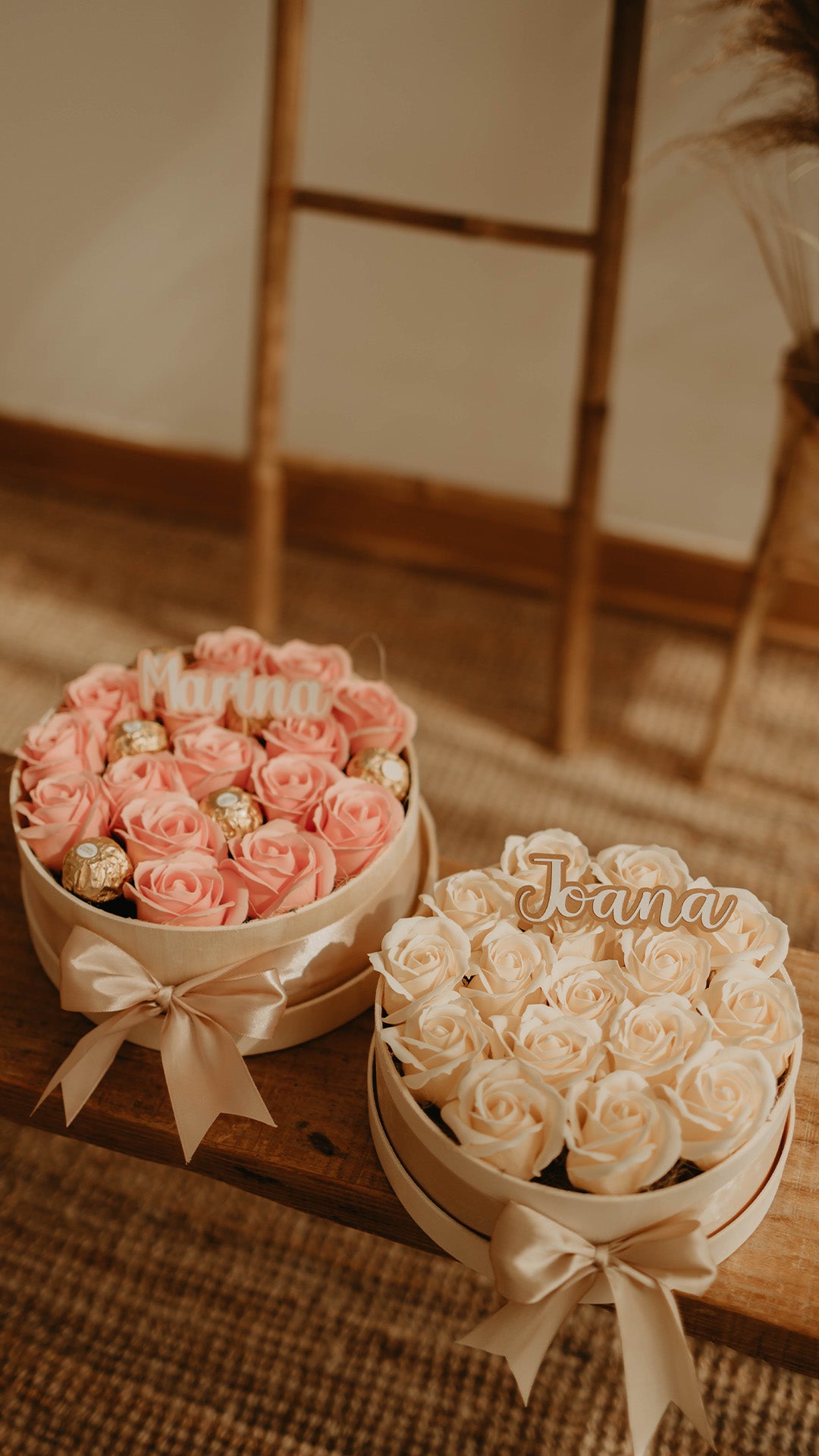 caixa redonda de madeira com rosas de sabão perfumadas, ursinho de peluche e balão personalizado.